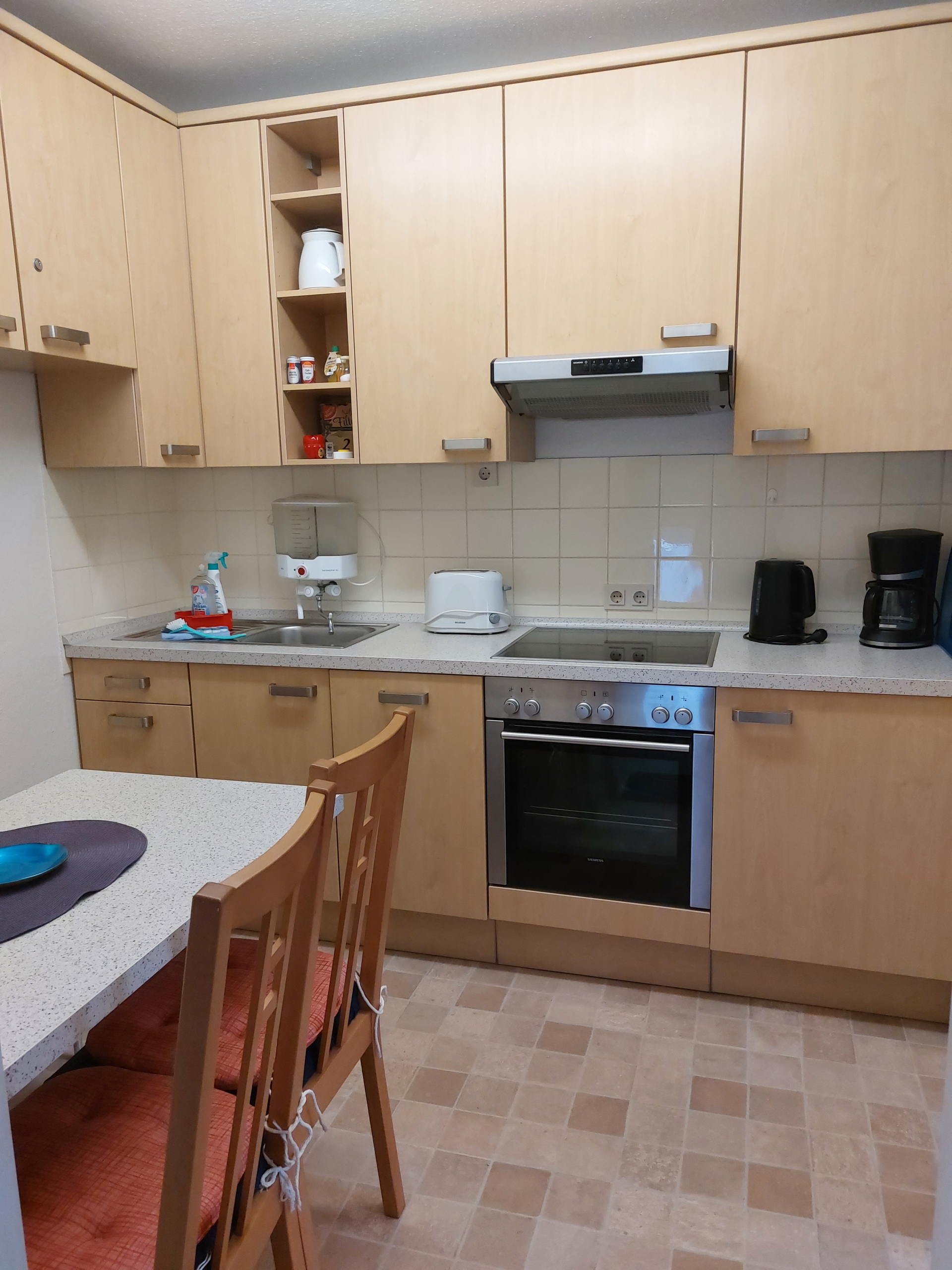 Die Küche ist ausgestattet mit 4 Platten-Ceranherd, Backofen, Geschirrspülmaschine, Kühlschrank sowie Essecke.