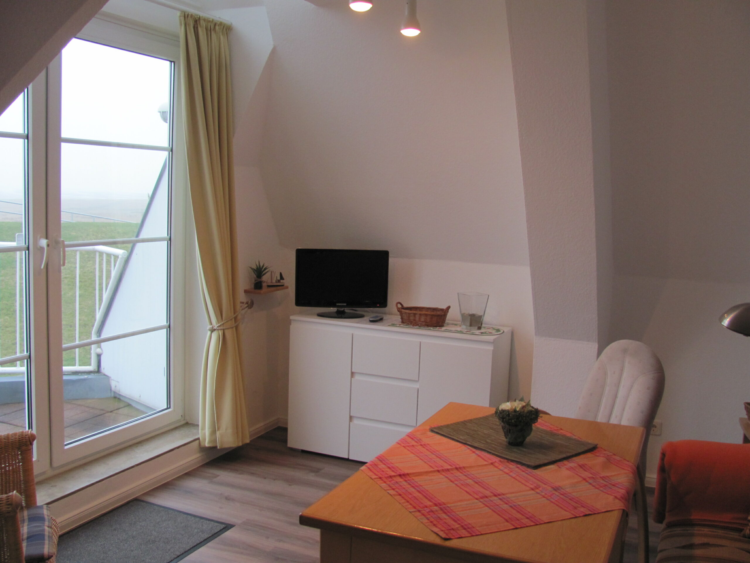 Die Wohnung verfügt über einen Wohnraum mit Sofaecke und Blick über den Deich, einen TV-Flach-Bildschirm und ein Radio sowie ein Schlafzimmer mit Ehebett.