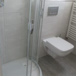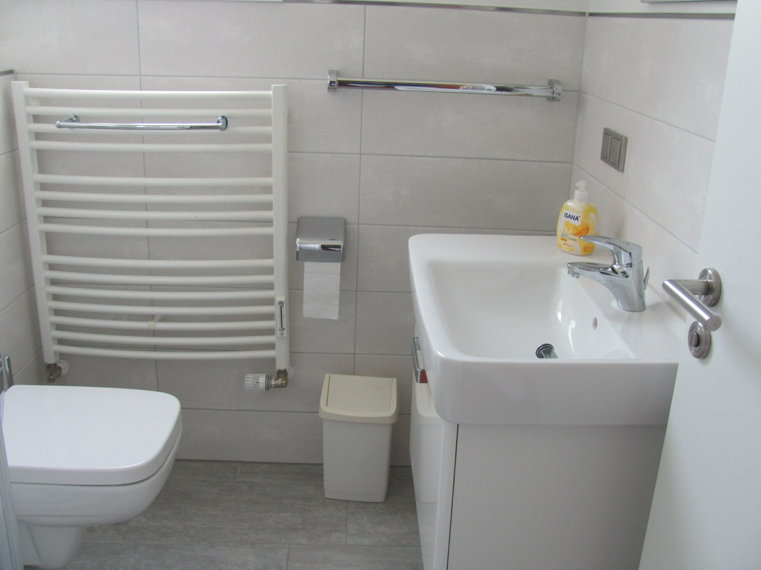 Die Küchenzeile ist ausgestattet mit 4-Platten-Ceran-Herd, Geschirrspüler und Kühlschrank. WC und ebenerdige Dusche.