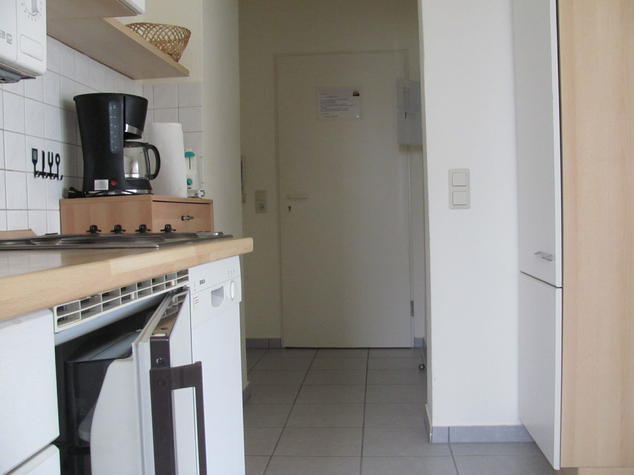 Die Küchenzeile ist ausgestattet mit 4-Platten-Herd, Mikrowelle, Geschirrspülmaschine und Kühlschrank, Dusche/WC