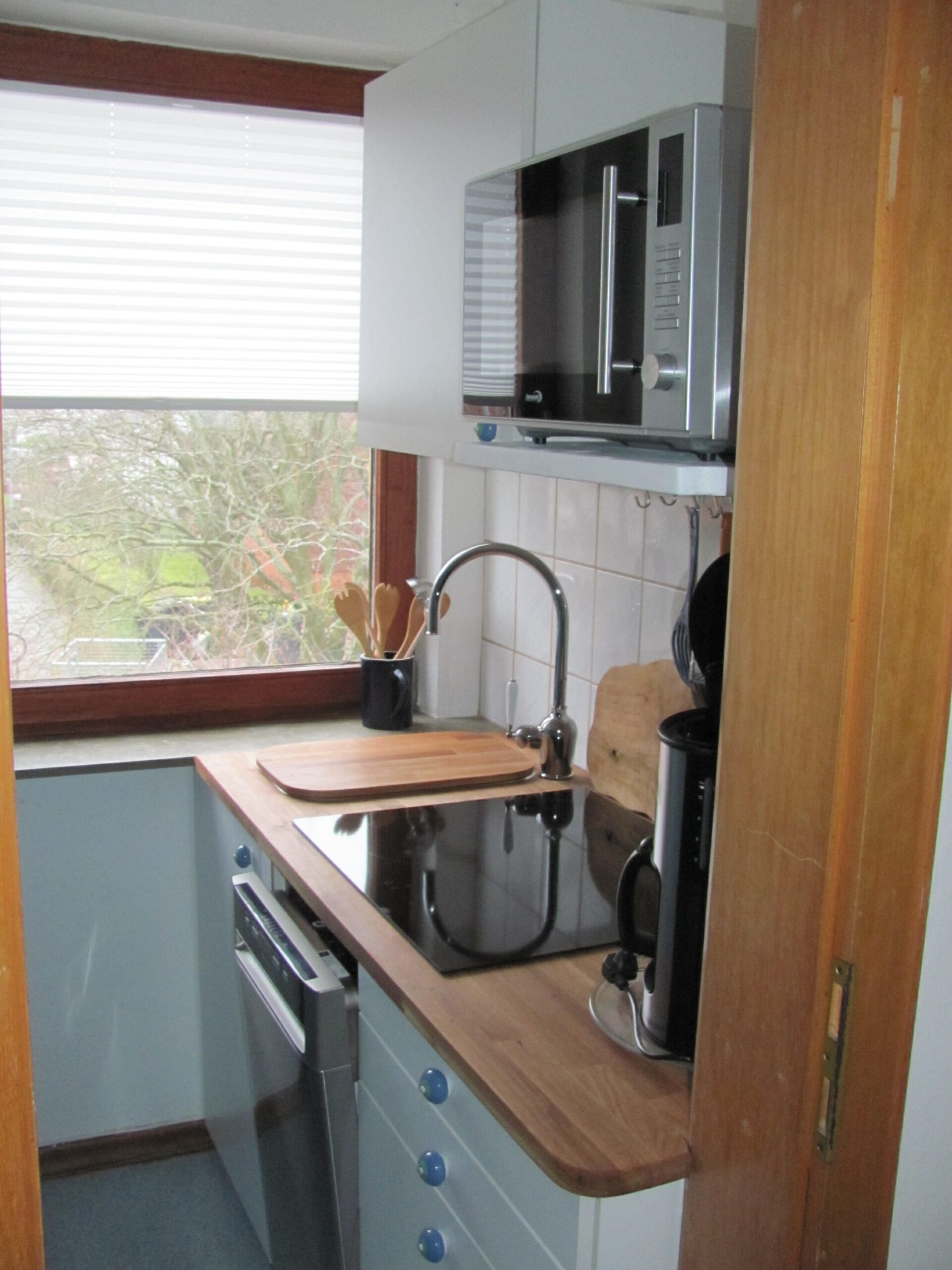 Diese verfügt über eine gut ausgestattete Küchenzeile mit 4-Platten-Herd-Ceranfeld, Backofen mit Mikrowelle und Geschirrspüler. Der Kühlschrank befindet sich im Wohnbereich.