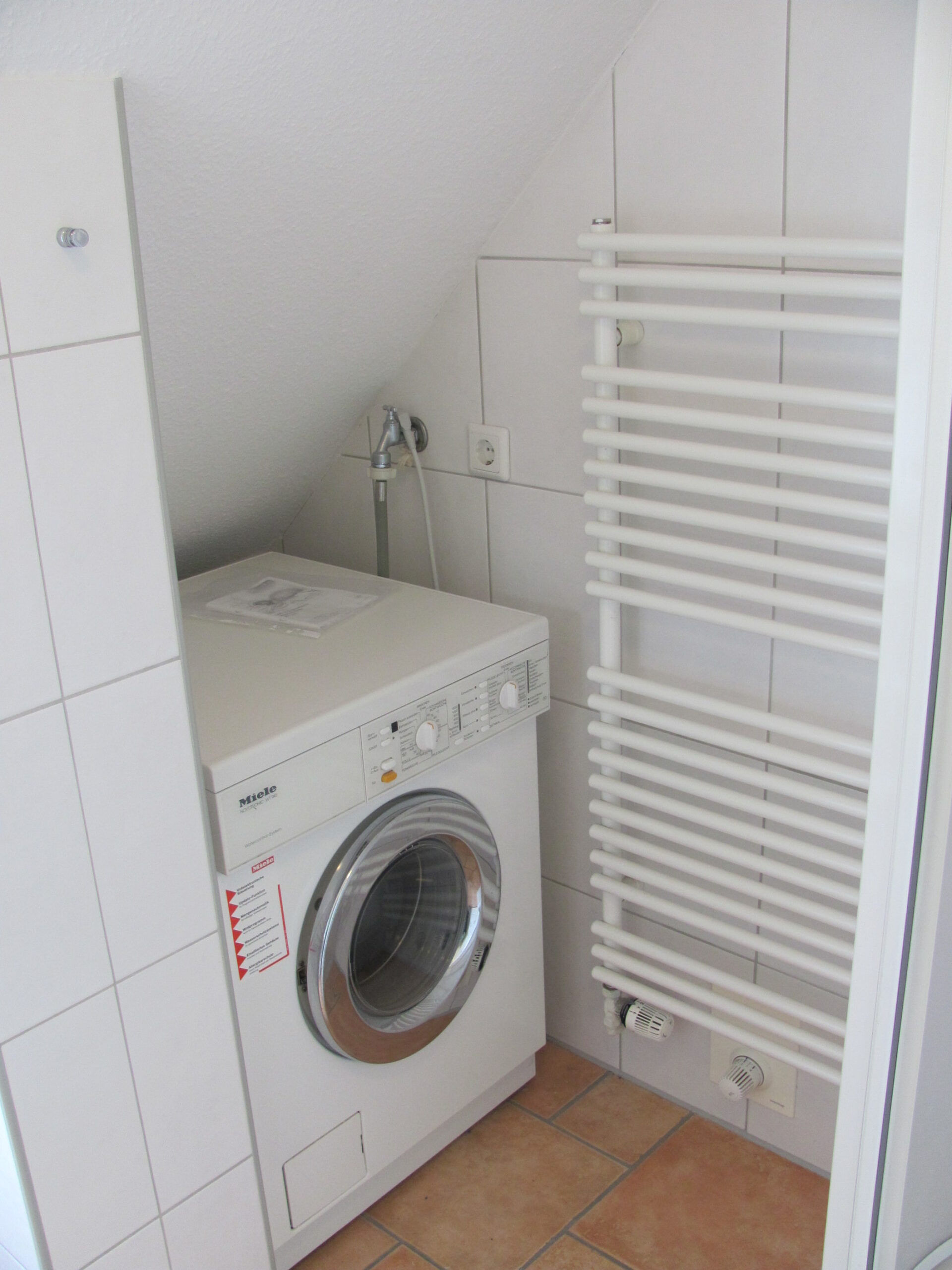 Im Badezimmer befindet sich neben der Dusche und dem WC auch eine Waschmaschine.